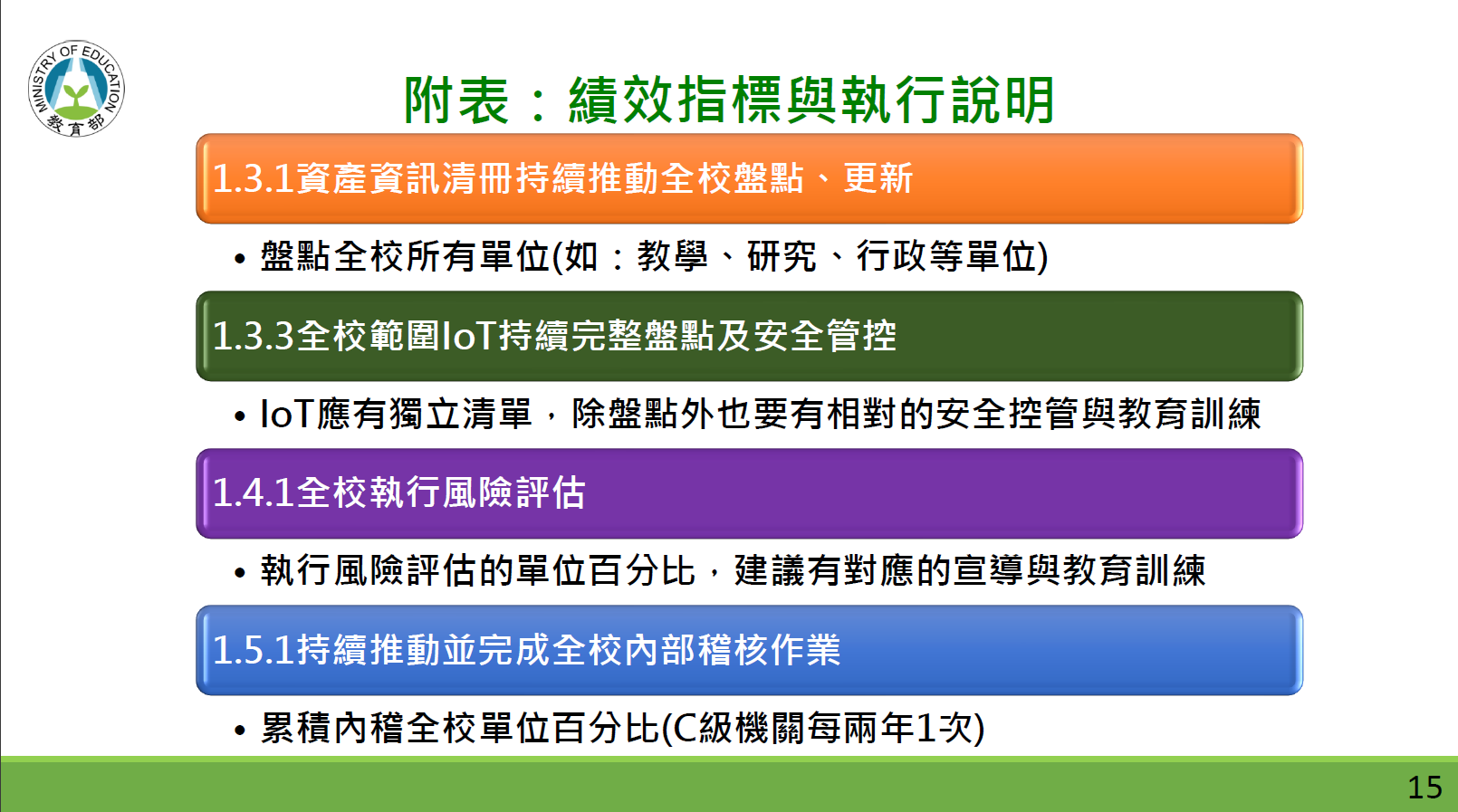 說明:依據教育部第二期高等教育深耕計畫資安強化專章評核指標要求,全校應完成「資訊資產盤點及風險評鑑」